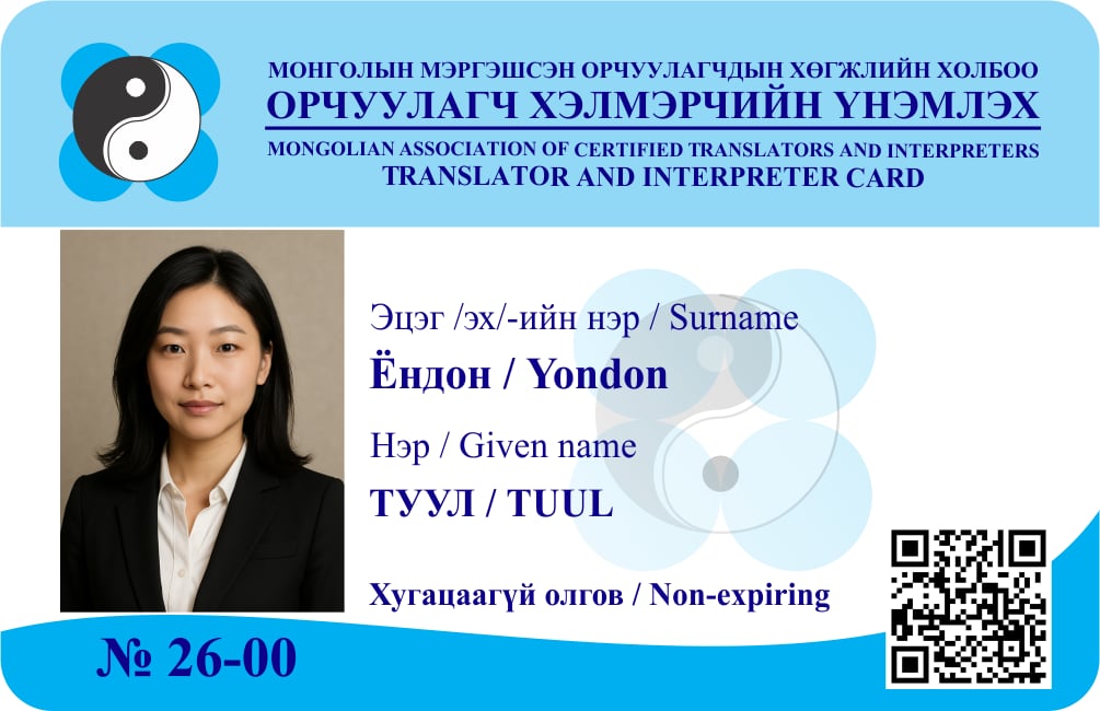 Монголын Мэргэшсэн Орчуулагчдын Хөгжлийн Холбооны гишүүн, орчуулагчийн үнэмлэхийг 2025 оны 2-р сарын 25-наас эхлэн хугацаагүй олгож эхэллээ.