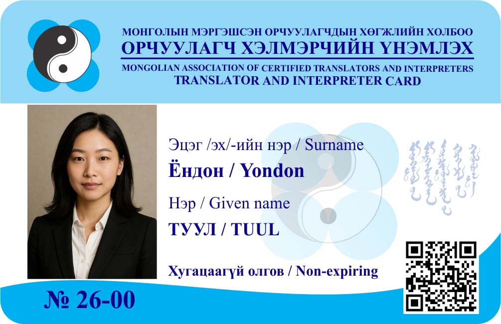 Монголын Мэргэшсэн Орчуулагчдын Хөгжлийн холбооны гишүүн, орчуулагчийн үнэмлэхийг 2025 оны 2-р сарын 25-наас эхлэн хугацаагүй олгож эхэллээ.